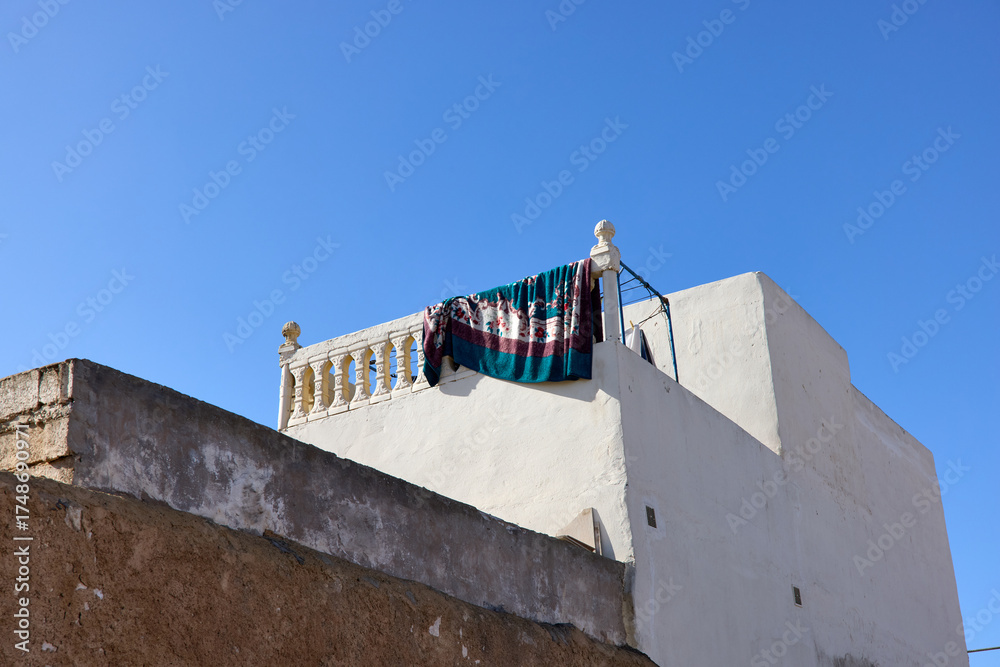 A vibrant blanket is draped over the railing of a rooftop in El'Jadida, Morocco. The clear blue sky enhances the colors of the fabric. The scene captures a peaceful moment in a quaint neighborhood #1748690971