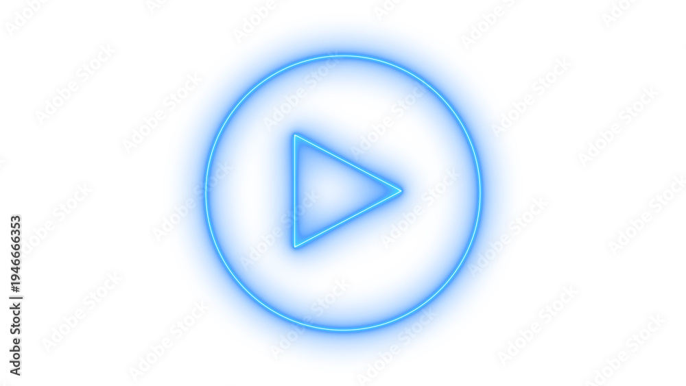 A vibrant blue neon glowing play button icon symbol in a circle, representing media playback, start, video, and audio applications, isolated on transparent background #1946666353