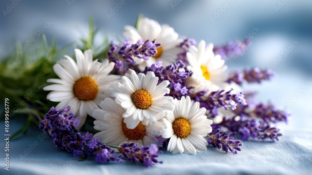A vibrant bouquet of fresh daisies and lavender sits elegantly on a soft blue fabric backdrop, radiating beauty and tranquility with its colorful natural elements. #1699965779