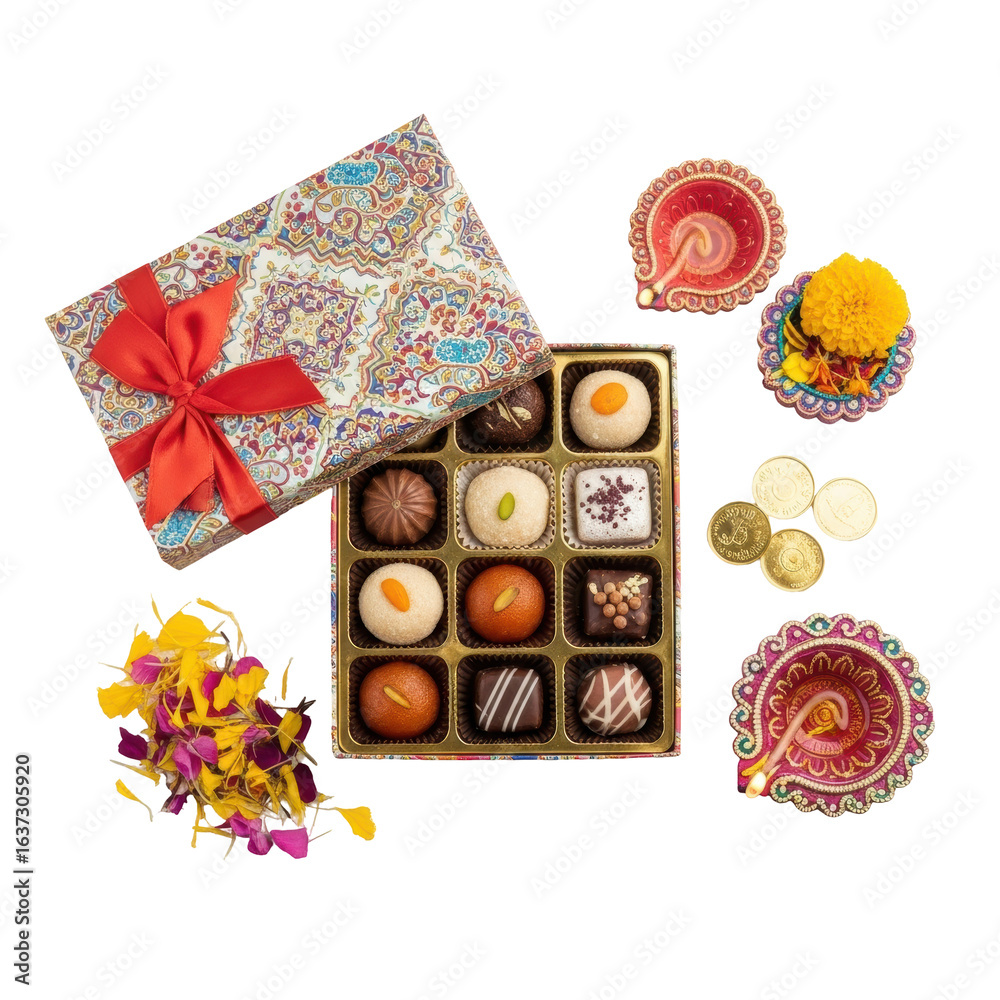 A vibrant collection of traditional indian sweets and chocolates in a decorative gift box, accompanied by festive diyas, flowers, and gold coins, perfect for celebrations like diwali. #1637305920