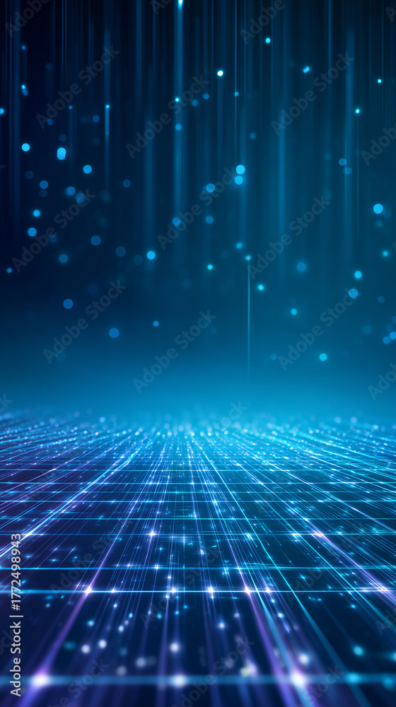 A vibrant digital landscape features glowing particles scattered in a deep blue space. Lines form a grid on the ground, creating a sense of depth and a futuristic feel, suitable for various projects #1772498943