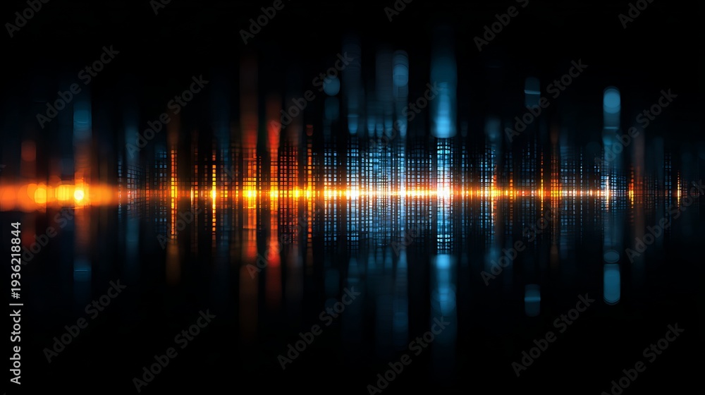 A vibrant digital sound wave with orange and blue lights against a dark background #1936218844