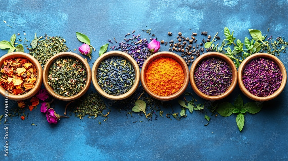 A vibrant display of colorful herbs and spices in small bowls, surrounded by loose ingredients and flowers on a blue background, showcasing natural ingredients for culinary or wellness use. #1972900763
