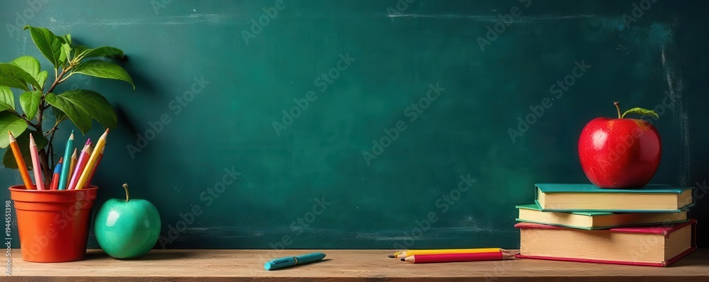 A vibrant educational template featuring colorful school supplies and a chalkboard for learning activities, supplies, design #1944551398