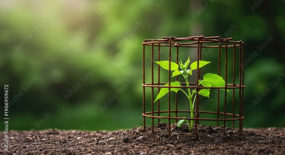 A vibrant green plant struggling to grow within the confines of a rusted metal wire cage set against a blurred natural background ,outside ,natural ,blurred #1906959672