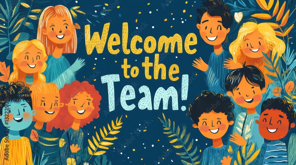 A vibrant, illustrated welcome banner, featuring smiling faces holding the words, "Welcome to the Team!" A welcoming gesture, ready to greet new members with warmth and enthusiasm. #1322290601