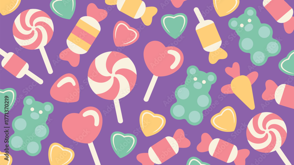 A vibrant pattern featuring an assortment of colorful candies on a purple background design of sweets #1771370219