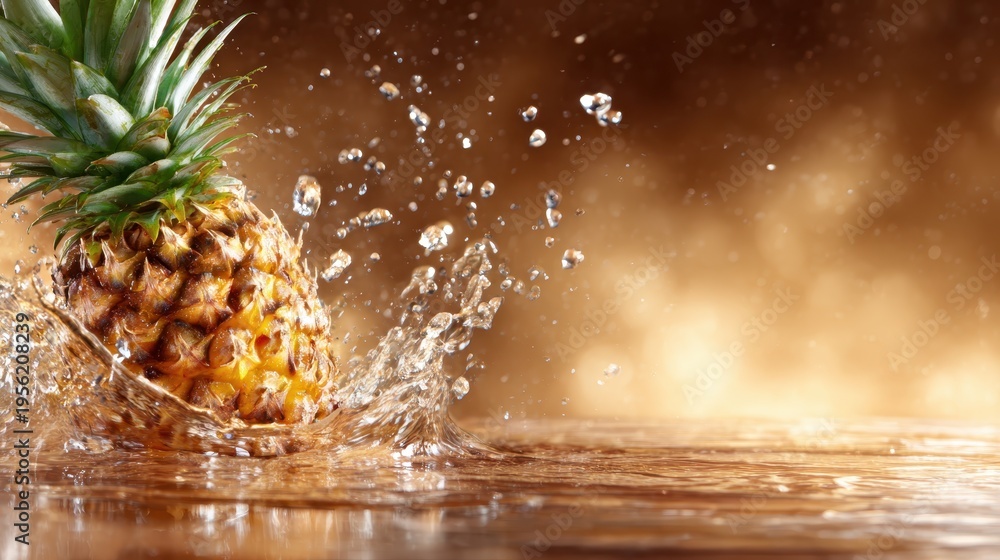 A vibrant pineapple splashes into clear water, creating dynamic droplets that capture the essence of freshness and vitality, perfect for food and drink themes in marketing. #1956208239