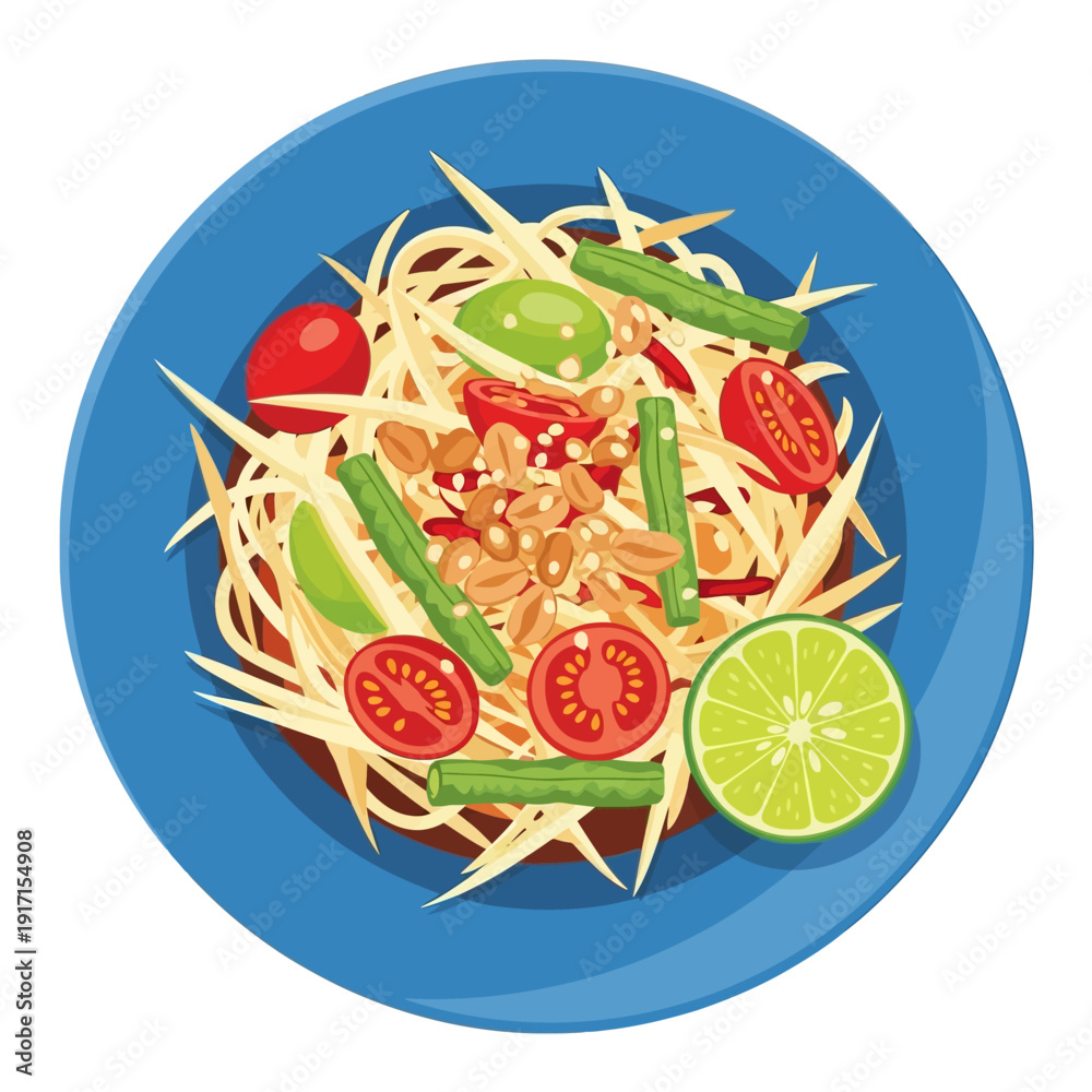 A vibrant plate of Som Tam salad with vegetables, nuts, and lime on a blue plate. #1917154908