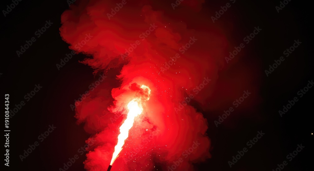 A vibrant red chemical flare burning intensely, emitting dense smoke and brilliant sparks into the dark atmosphere during a nighttime celebration or signal ,texture ,hot ,rescue #1910844343