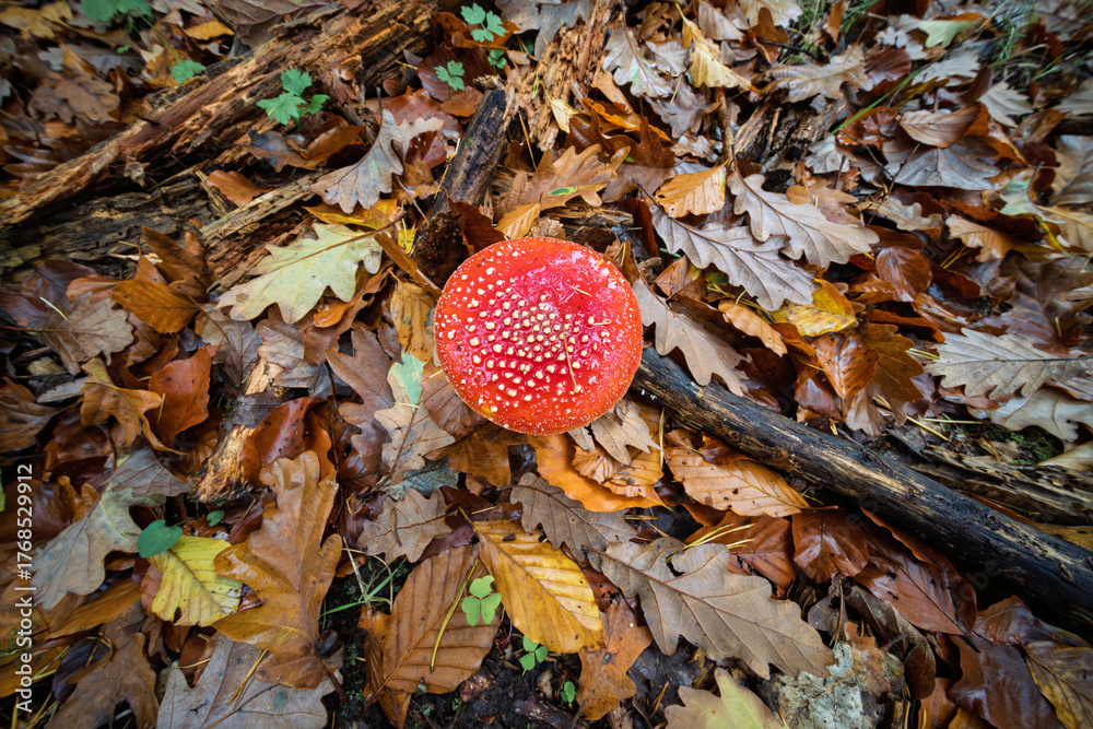 A Vibrant Red Mushroom Stands Out Amidst Colorful Autumn Leaves in a Peaceful Forest #1768529912