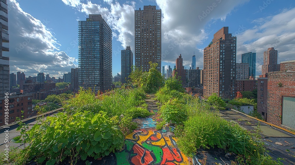 A vibrant rooftop garden amidst urban skyscrapers, showcasing nature's resilience in the city. #1108540806