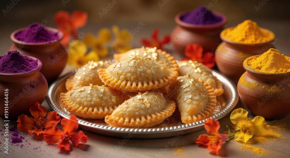 A vibrant still life featuring golden gujia sweets surrounded by colorful holi powders and flowers #1911464416