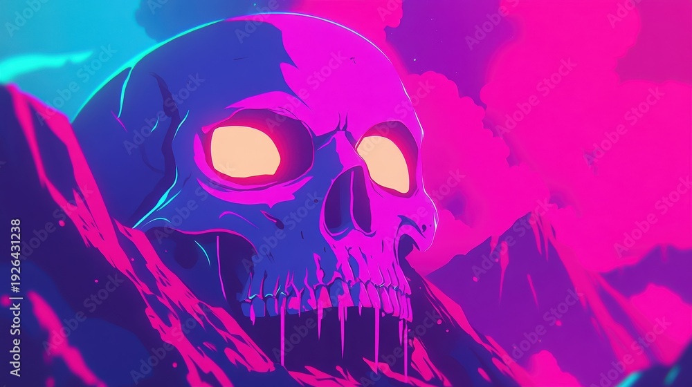 A vibrant, surreal illustration of a giant skull amidst colorful landscapes evokes a sense of mystery and intrigue, perfect for projects related to fantasy, art, gaming, or Halloween themes, #1926431238