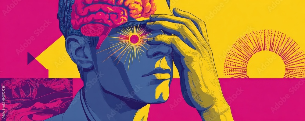 A vibrant, surreal illustration of a person with a colorful brain, conveying themes of awareness and mental struggle against a bold, abstract background. #1900729788
