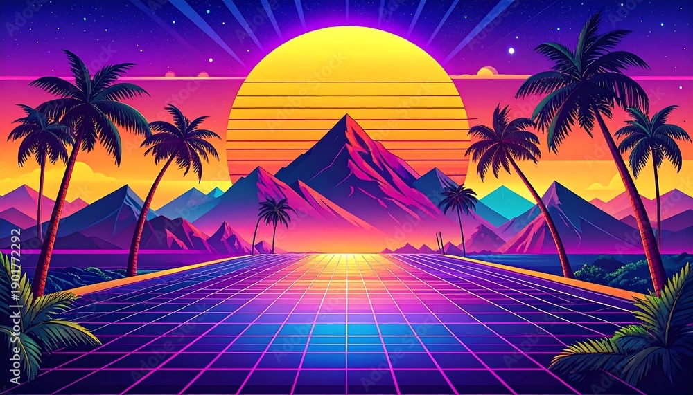 A vibrant synthwave scene, featuring a neon-lit landscape with palm trees, mountains, and a large sun setting #1901772292