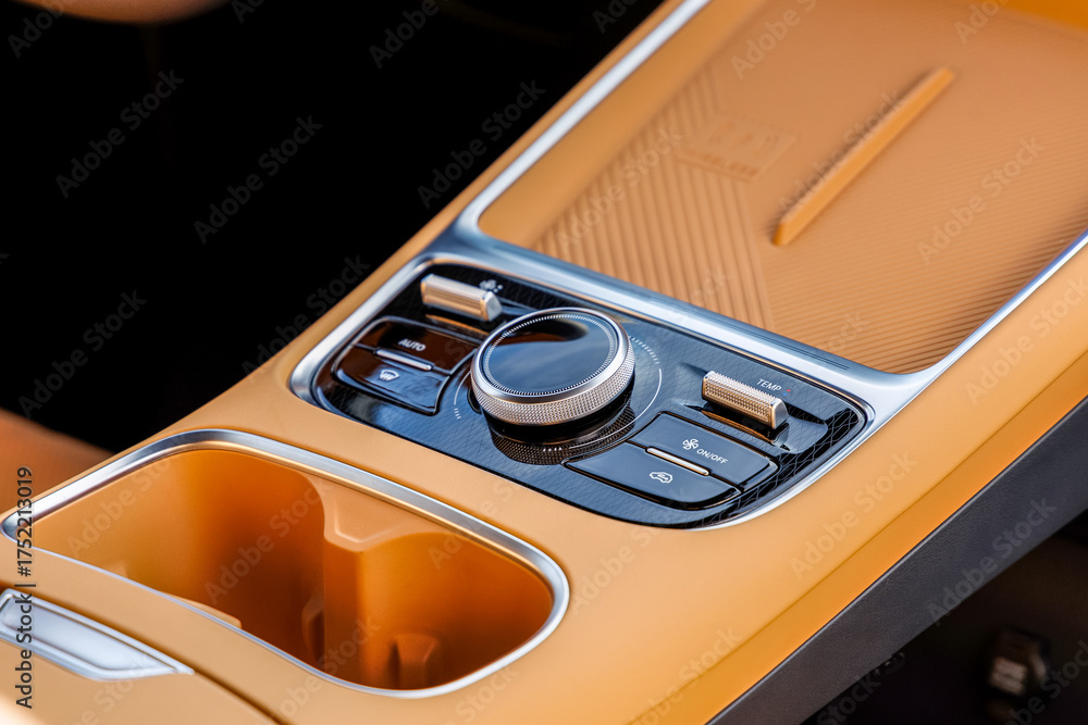 A vibrant top-down view of a premium vehicle's center console, featuring a unique tan and mustard leather finish #1752213019