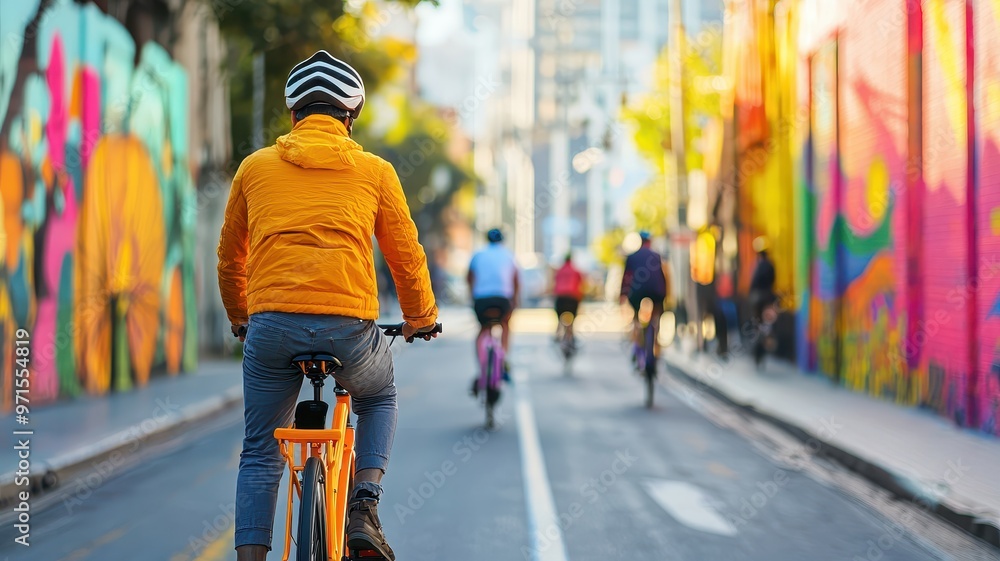 A vibrant urban scene with a cyclist in an orange jacket riding past colorful street art and other cyclists on a sunny day. #971554819