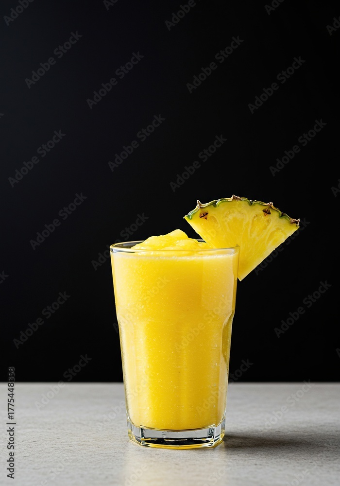 A vibrant yellow pineapple smoothie in a clear glass, garnished with a fresh slice of pineapple, perfect for a refreshing tropical treat ,fruit ,blended ,healthy options #1775448358