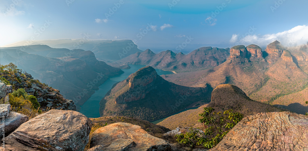 A view from the rim of Blyde River Canyon towards the dam and the three Rondavels, Mpumalanga, South Africa in Springtime #1750892157