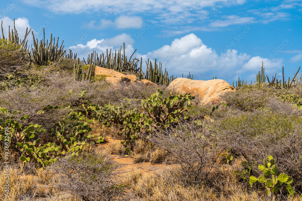 A view of cacti and shrub and rocks beside the Alto Vista Chapel on the Atlantic coast of Aruba on a bright sunny day #1936822475