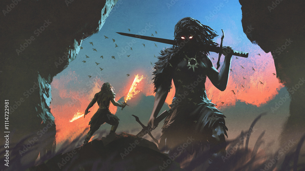 A Viking wielding twin fiery swords confronts a towering giant warrior under a burning sky, set in an epic fantasy scene, digital art style, illustration painting #1114722981