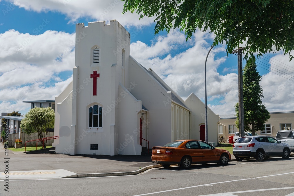 A vintage orange car parked in front of a historic white church. Sunny day, quiet street scene. METHODIST CHURCH, LEVIN, MANAWATU-WANGANUI, NEW ZEALAND #1191726890