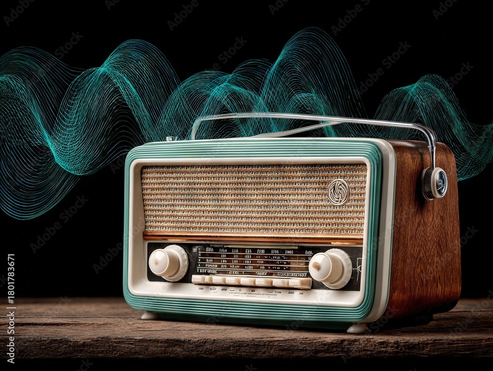 A vintage teal-trim radio rests on a rustic wooden surface as glowing turquoise sound waves rise behind it, blending classic design with modern rhythm and luminous energy #1801783671