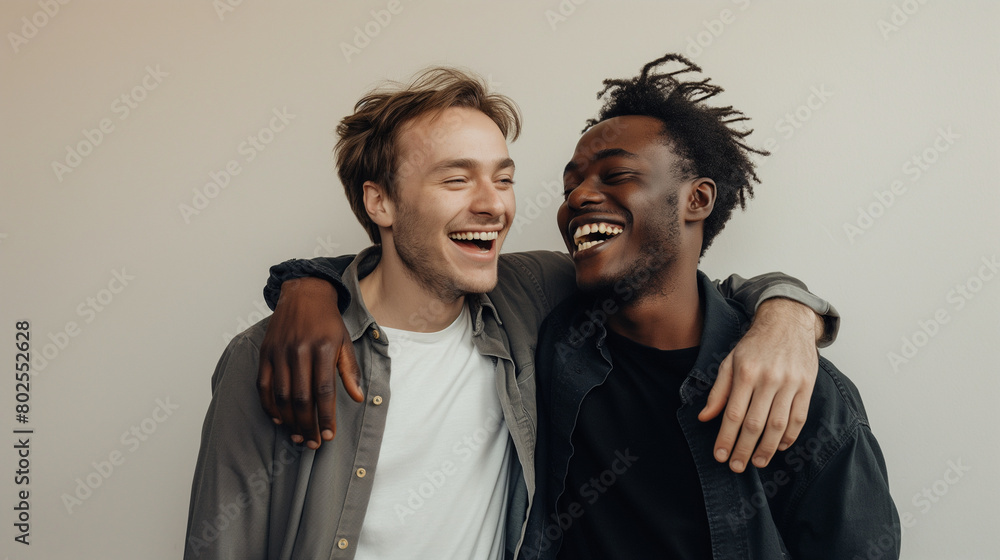 A waist-high view photograph capturing the beaming smiles of a couple of men, standing side by side against a plain background, their arms casually draped over each other's shoulde #802552628