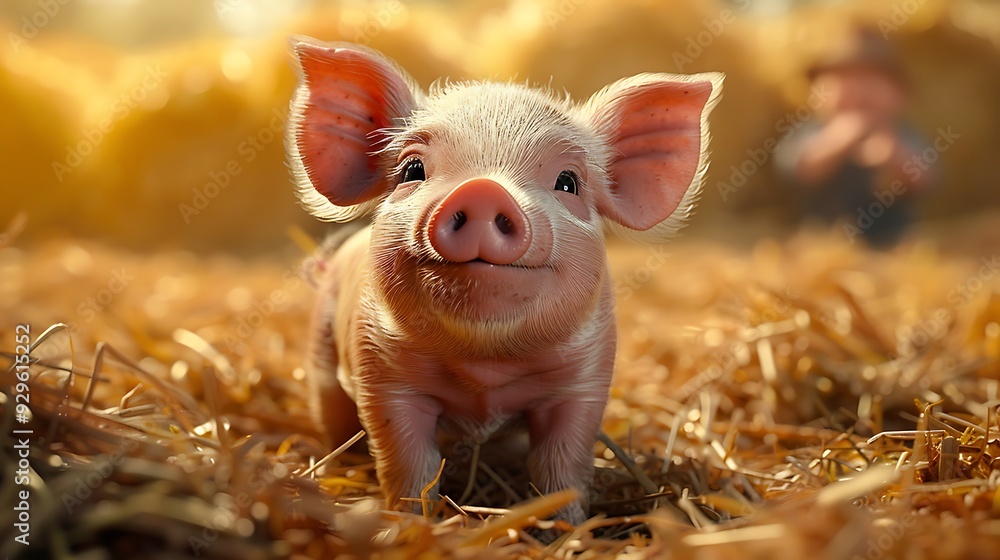 A wallpaper featuring a piglet playing in a hay-filled pen, with a farmer smiling in the background #929615252