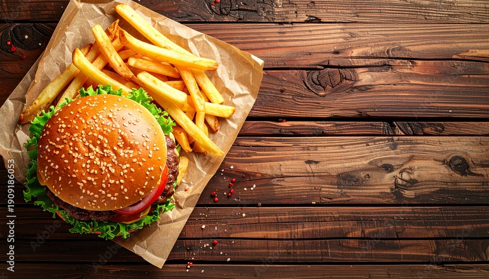 A warm and appetizing classic beef hamburger served with golden french fries on parchment paper, captured in a high-angle flat lay shot on a rustic dark brown wooden table. #1909186053