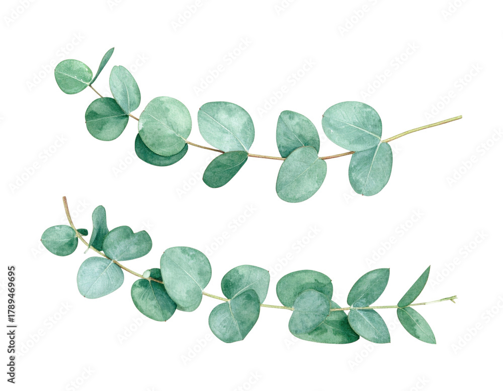 A watercolor foliage branch PNG element (eucalyptus style) with soft edges and subtle grain, isolated on transparent background, PNG #1789469695