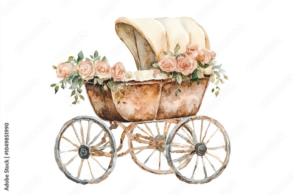 A watercolor illustration of a baby carriage decorated with flowers #1049851990