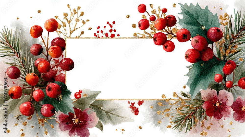 A watercolor illustration with red berries, green pine branches, gold accents, and flowers framing a blank center. A winter backdrop for Christmas cards and invitations. #1773779603
