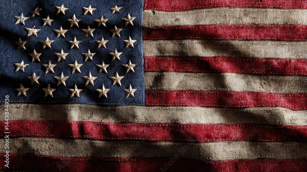 A weathered American flag, its colors faded and fabric worn, showing the passage of time and resilience. #1449844936