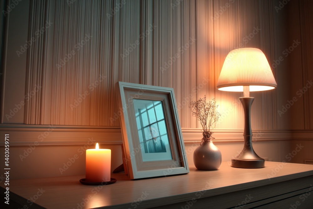 A wedding photo resting on a nightstand beside a flickering candle #1403059711