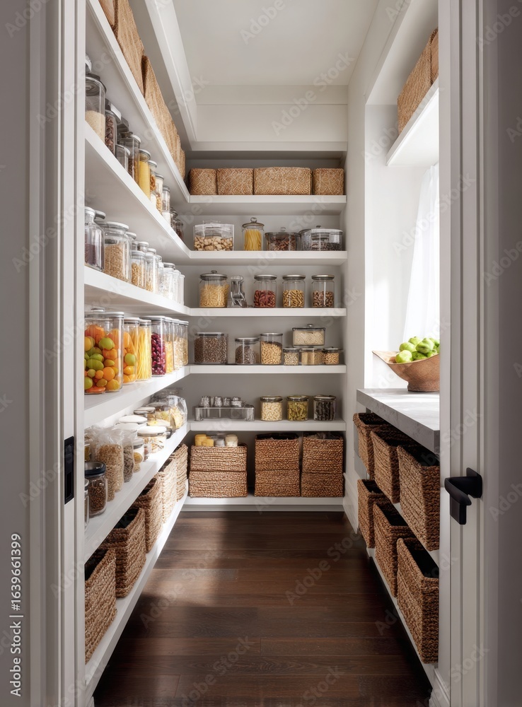 A well-organized pantry with white shelves, filled with jars, boxes, and various food items, creating a neat and functional storage space for kitchen essentials. #1639661399