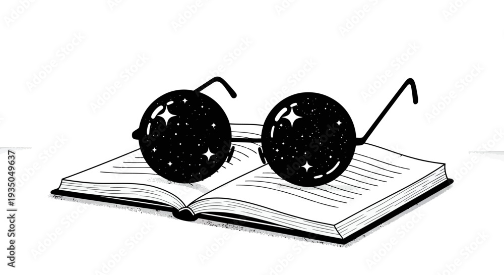 A whimsical black and white illustration of round glasses with starry lenses resting on an open book, suggesting imagination and knowledge. #1935049637