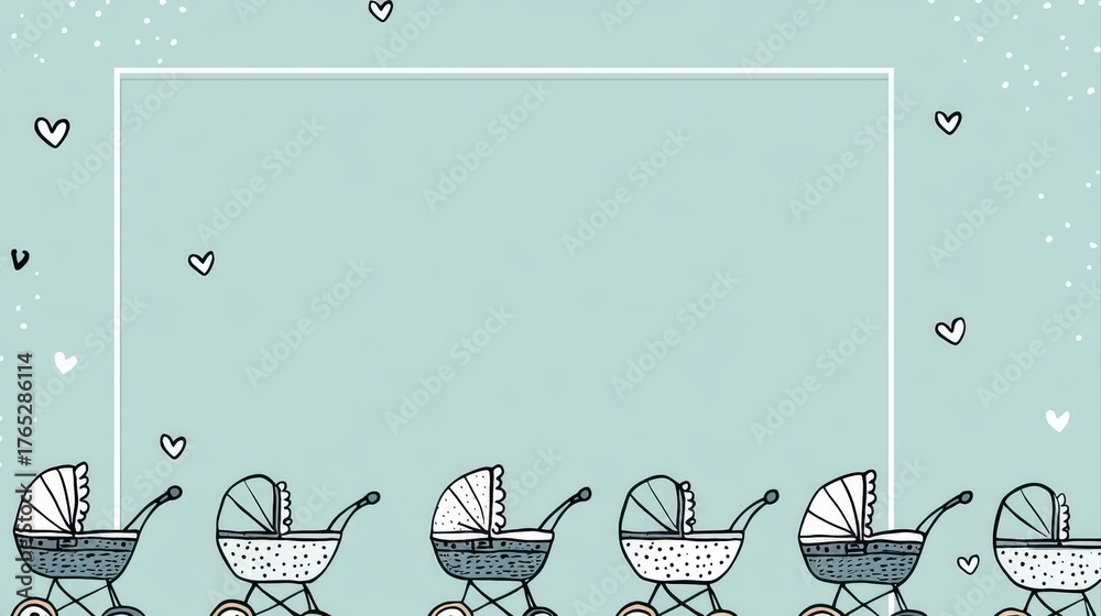 A whimsical illustration featuring baby strollers on a pastel background, adorned with hearts and a blank space for personalization, baby and mom background #1765286114