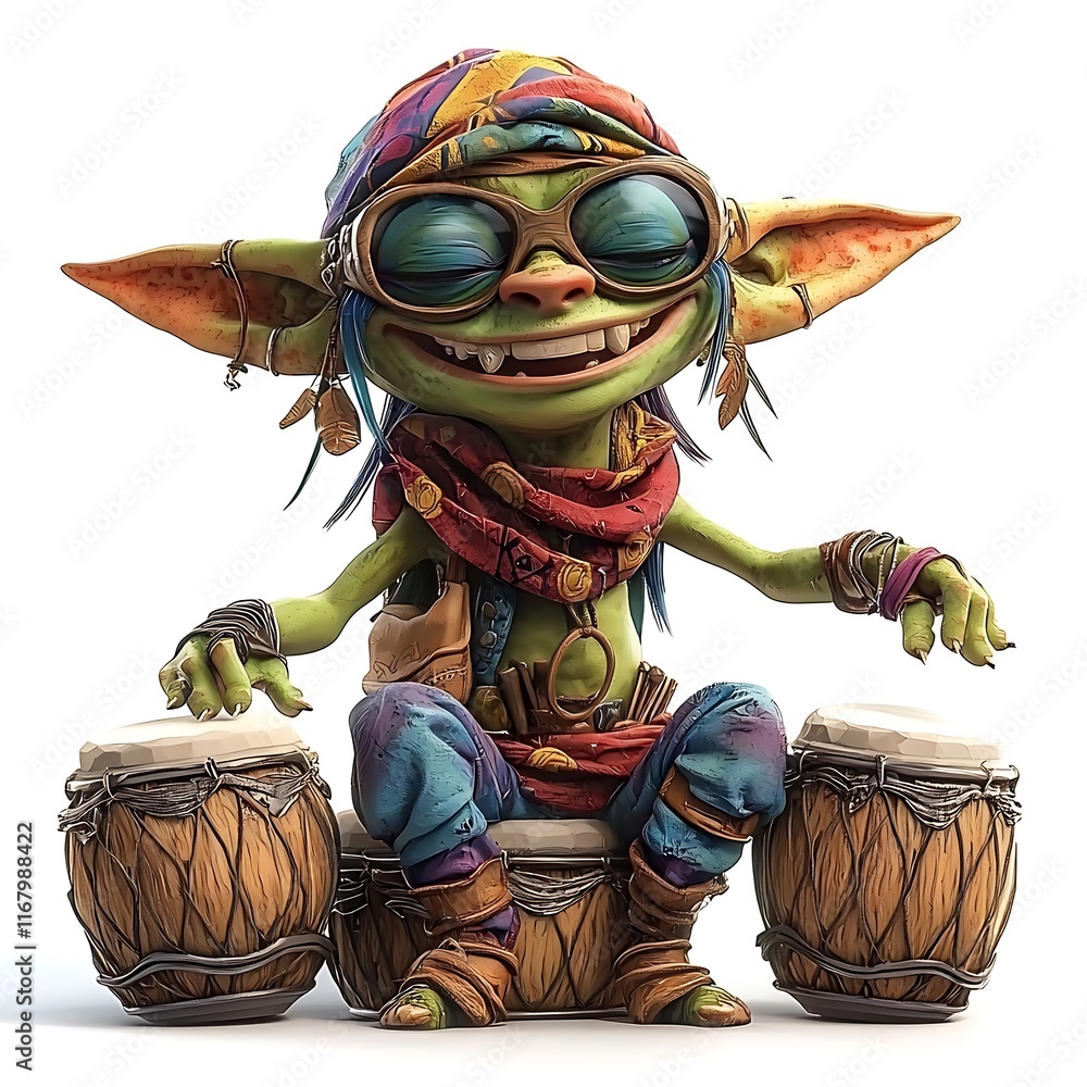 A whimsical illustration of a cheerful green goblin wearing goggles and a colorful bandana, joyfully playing a pair of bongo drums. #1167988422