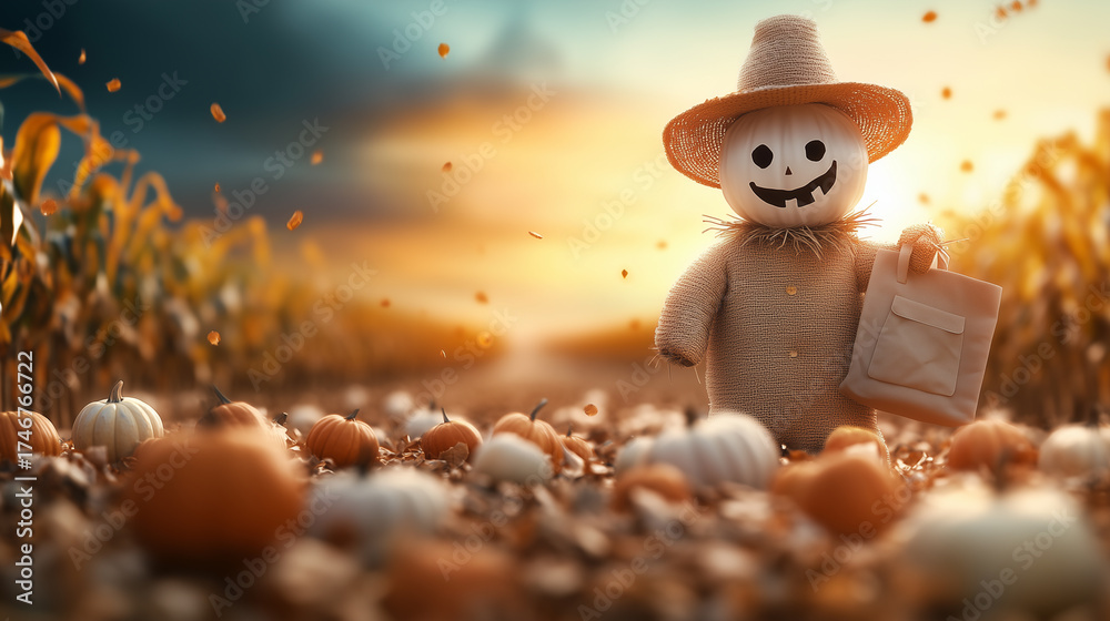 A whimsical scarecrow standing amidst a field of pumpkins during sunset, capturing the essence of autumn harvest #1746766722