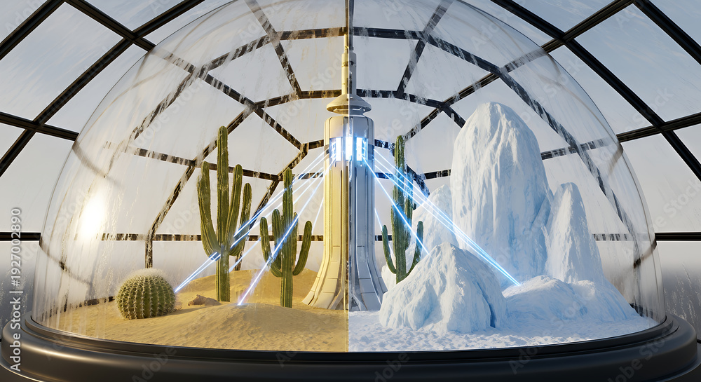 A white industrial clock tower with glass and steel architecture stands against a blue sky amidst city building construction and metal scaffolding #1927002890