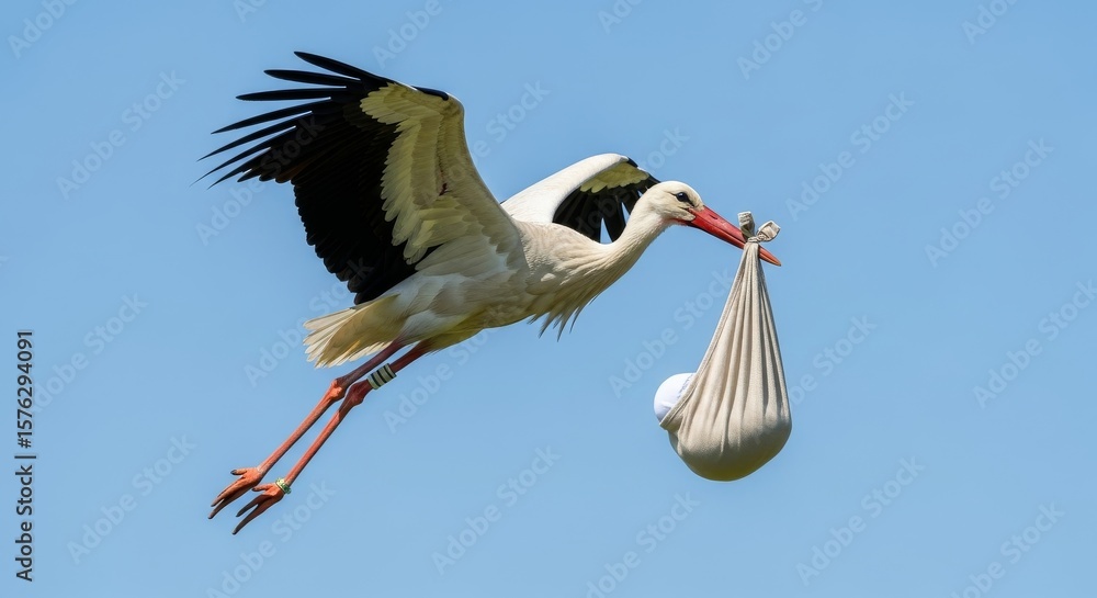 A White stork carries a newborn baby in a cloth bundle, symbolizing the classic folklore of storks delivering babies. #1576294091