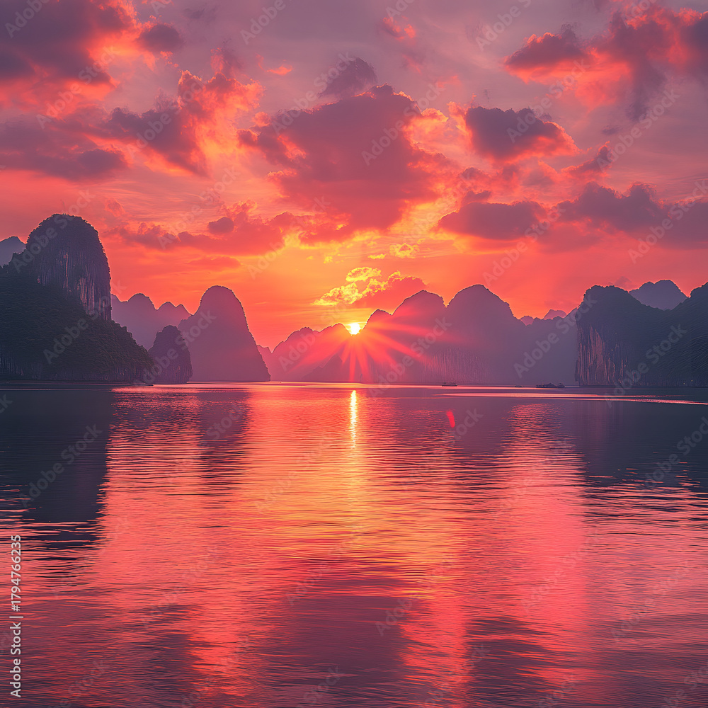 A wide-angle photograph of Ha Long Bay at sunset, glowing pink and orange clouds reflecting on calm shimmering water, limestone karst mountains silhouetted against the vibrant sky. #1794766235