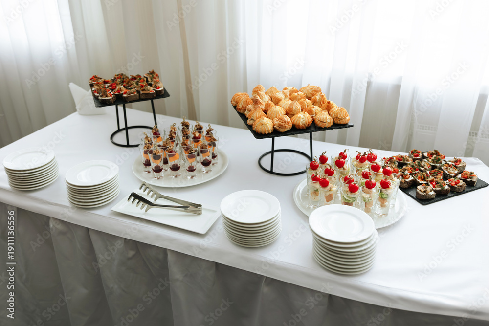 A wide-angle shot of a clean, professional catering buffet table set with white linens #1911136556