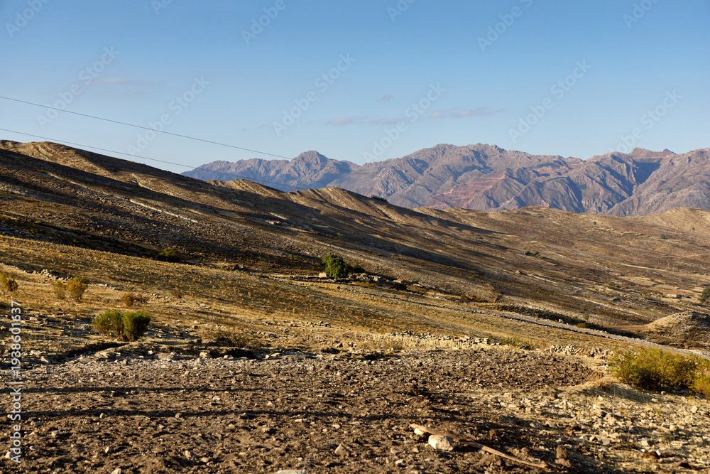 A wide view of the dry Bolivian highlands, showing sunlit brown hills leading to craggy mountain ranges under a clear sky. #1938601637