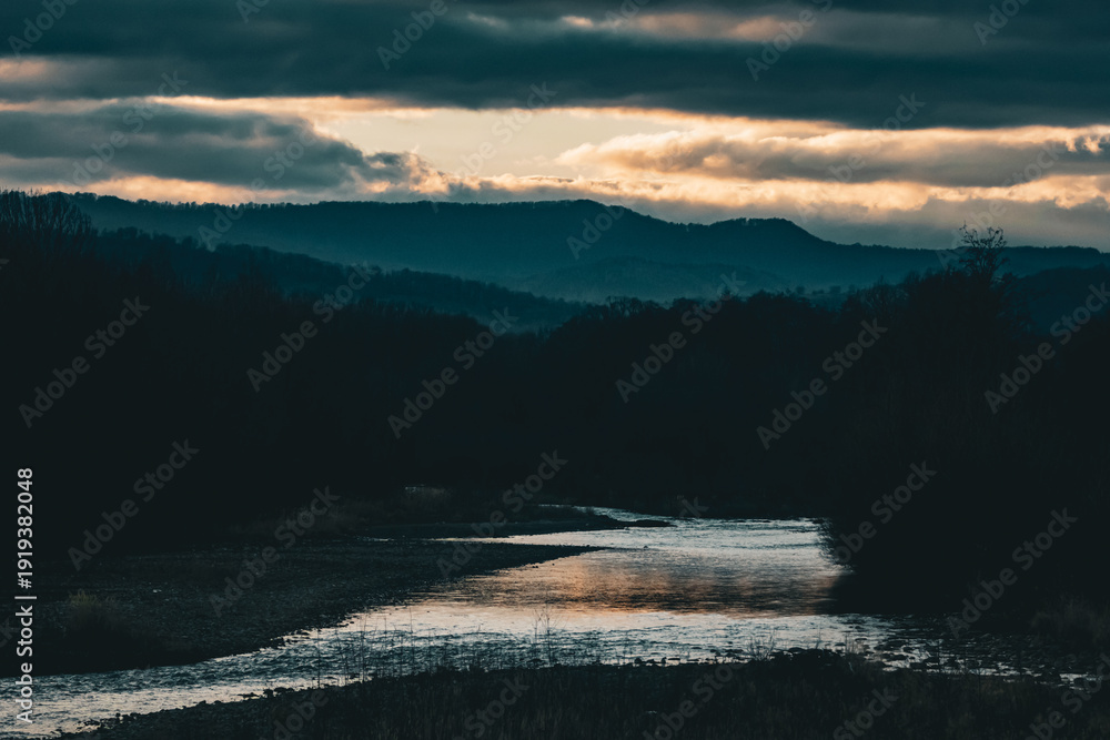 A winding river mirrors a narrow band of fading light beneath heavy clouds. Blue layers of distant hills fade into shadow while evening settles quietly across the valley. #1919382048