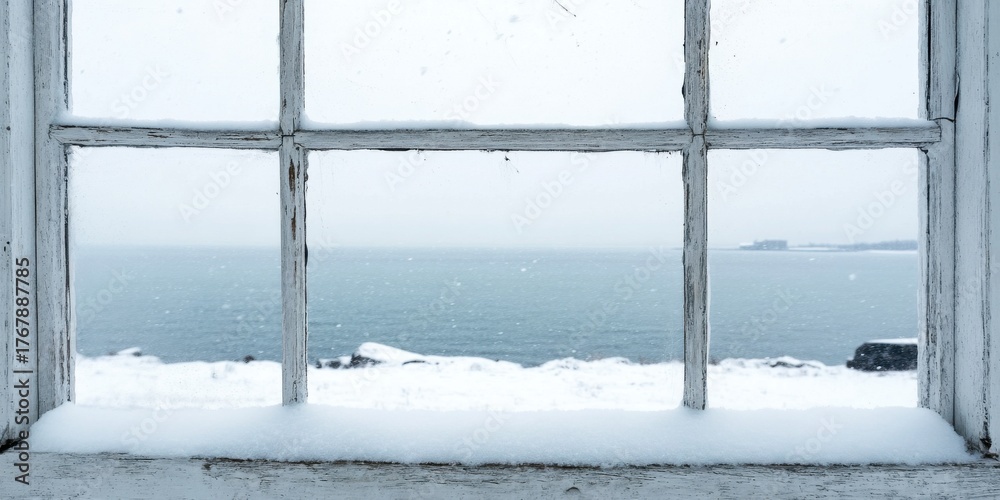 A winter seascape viewed through a beautifully snowy window, presenting a serene atmosphere #1767887785