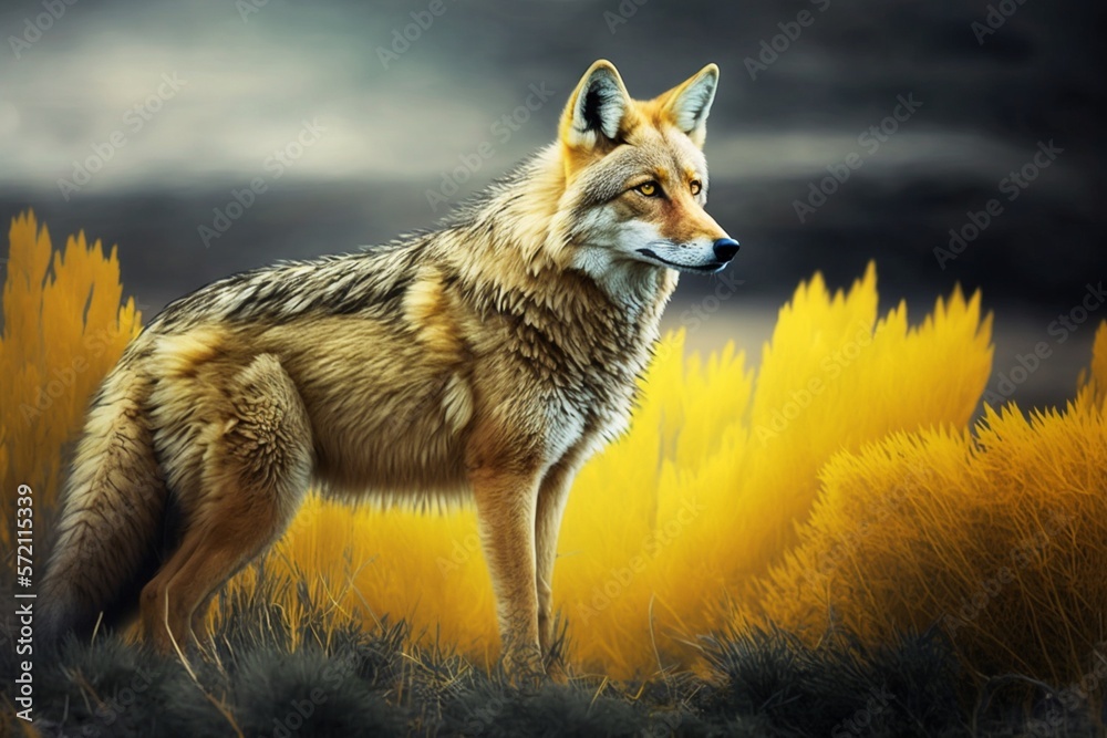 a wolf standing in a yellow field of tall grass #572115339