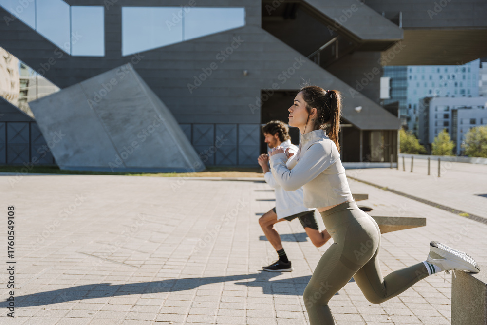 A woman and a man squat on one leg while leaning their other legs on stone chairs #1760549108